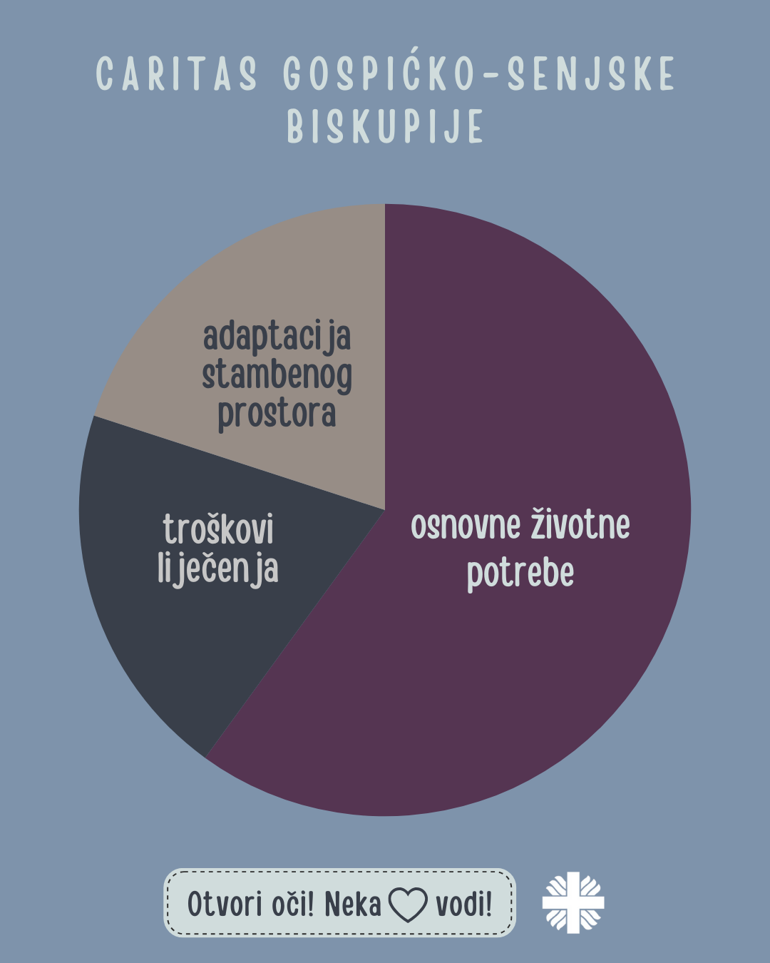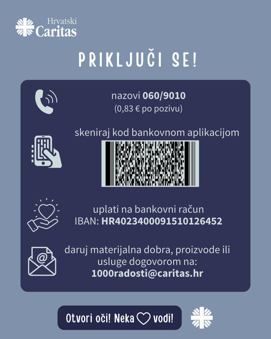 Hrvatski Caritas ovogodišnji humanitarni program Za 1000 radosti provodi pod sloganom „Otvori oči! Neka srce vodi!“ te nas potiče da otvorimo oči za potrebe drugih i činimo dobra djela. Hrvatski Caritas zahvaljuje svima koji su se dosad uključili u program i tako omogućili da pomoć stigne do onih koji su u potrebi. Sredstva u programu Za 1000 radosti prikupljaju se tijekom cijele godine, a uključiti se možete: