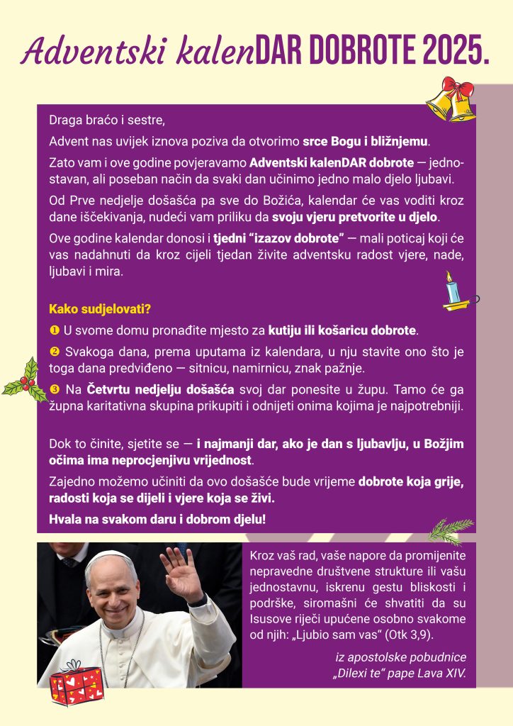 Pozivamo sve ljude dobre volje da se pridruže ovogodišnjem Adventskom kalenDARu. Neka ovo vrijeme priprave za Božić bude prigoda da zajedno unesemo nadu u živote onih u potrebi te da kao župne zajednice izgradimo još snažnije mostove dobrote.