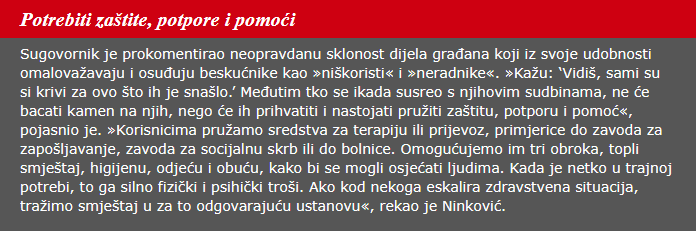 Komentirajući laička objašnjenja beskućništva, koja se kreću od teze “sami su krivi” do teze “krivo je društvo”, sugovornik je pojasnio da takva objašnjenja najčešće nisu točna ili su nepotpuna. Postoje svijetli primjeri izlaska osoba iz beskućništva i trajnoga povratka u svijet rada, posvjedočio je sugovornik, ali socijalno isključenim osobama to je vrlo teško postići. Baš zbog toga ustanove i sugrađani trebaju im biti potpora. “Postoje primjeri gdje osoba odluči iskoprcati se iz beskućništva i uspije u tome. Kod beskućnika govorimo o ljudima koje društveni sustav ne želi prepoznati i koji su mu teret, a oni žele biti dijelom toga sustava. Kada u tome ne uspiju, psihički obolijevaju i dolazi do životne havarije. Postoje ljudi koji će se izvući iz takve situacije vlastitom snagom – koji si zacrtaju određeni cilj ili smisao – te ga i ostvare. Takvih je vrlo malo. Mi smo ustanova koja korisnicima omogućuje mir i prostor u kojem mogu donijeti ispravnu odluku. Nakon što donesu odluku, institucionalno će im se pomoći – stručnim i savjetodavnim radom, edukacijama, pisanjem životopisa, posredovanjem pri zapošljavanju – da krenu prema novomu početku”, rekao je Ninković.