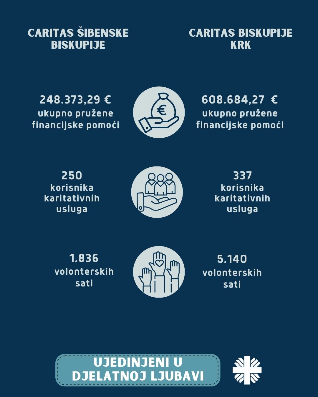 Korisnicima svakodnevnu podršku pružaju ne samo djelatnici, već i mnogobrojni volonteri, kako biskupijskih, tako i župnih Caritasa. U pomoć koja je pružena korisnicima utkani su brojni volonterski sati, točnije, 10.080 volonterskih sati u Caritasu Šibenske biskupije i 2.015 volonterskih sati u Caritasu Biskupije Krk.