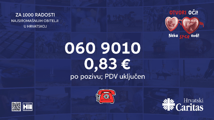 Hrvatski Caritas ovogodišnji humanitarni program Za 1000 radosti provodi pod sloganom „Otvori oči! Neka srce vodi!“ te nas potiče da otvorimo oči za potrebe drugih i činimo dobra djela. Hrvatski Caritas zahvaljuje svima koji su se dosad uključili u program i tako omogućili da pomoć stigne do onih koji su u potrebi. Sredstva u programu Za 1000 radosti prikupljaju se tijekom cijele godine, a uključiti se možete: