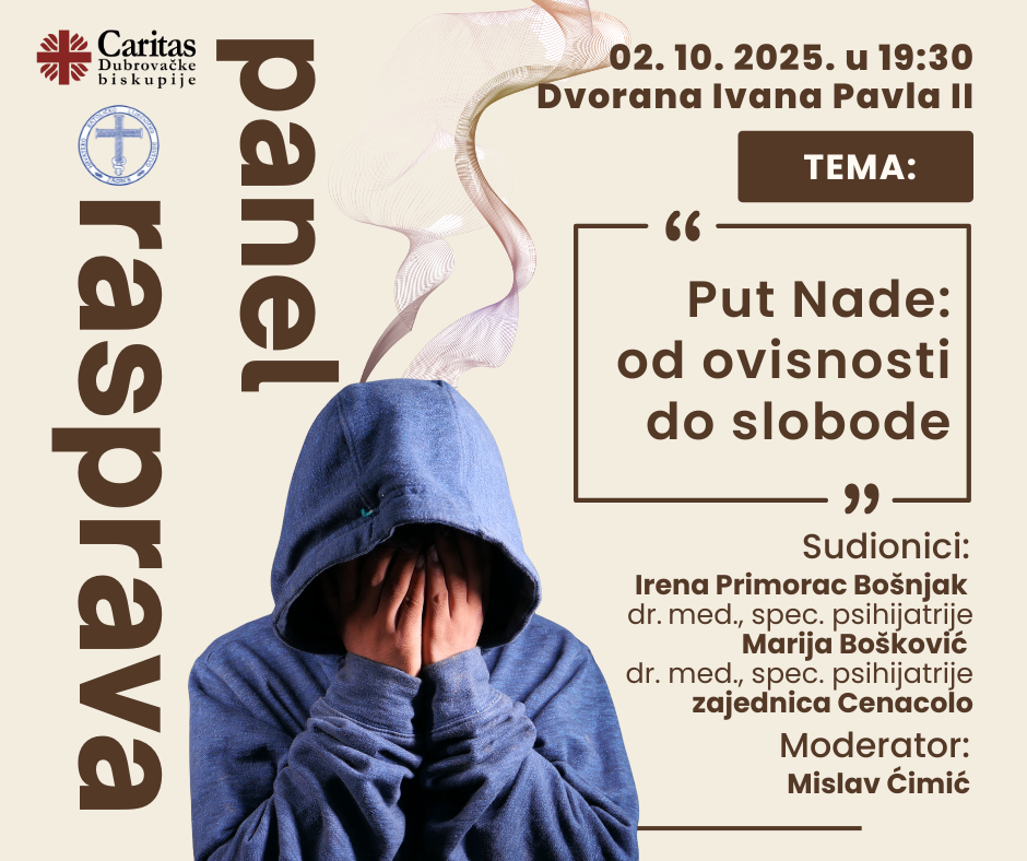 U četvrtak 2. listopada u dvorani Ivana Pavla II. u Dubrovnik u 19.30 sati panel raspravu na temu “Put nade: od ovisnosti do slobode” biskupijski Caritas organizira u suradnji s Hrvatskim katoličkim liječničkim društvom – podružnica Dubrovnik. Na panelu će govoriti: dr. med. Irena Primorac Bošnjak, spec. psihijatrije, dr. med. Marija Bošković, spec. psihijatrije i zajednica Cenacolo. Moderator večeri je Mislav Ćimić.