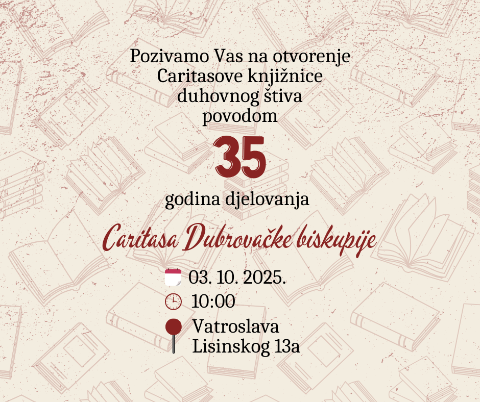 U petak 3. listopada u prostorijama Caritasa u 10 sati otvorit će se Caritasova knjižnica. Biskupijski Caritas će tako u ponudi imati knjige katoličkog sadržaja različitih književnih žanrova kako bi svojim korisnicima, kao i drugim zainteresiranim osobama, omogućio posudbu djela koja im mogu pružiti duhovnu i psihološku podršku te poticaj za osobni rast i osnaživanje u vjeri, nadi i ljubavi.