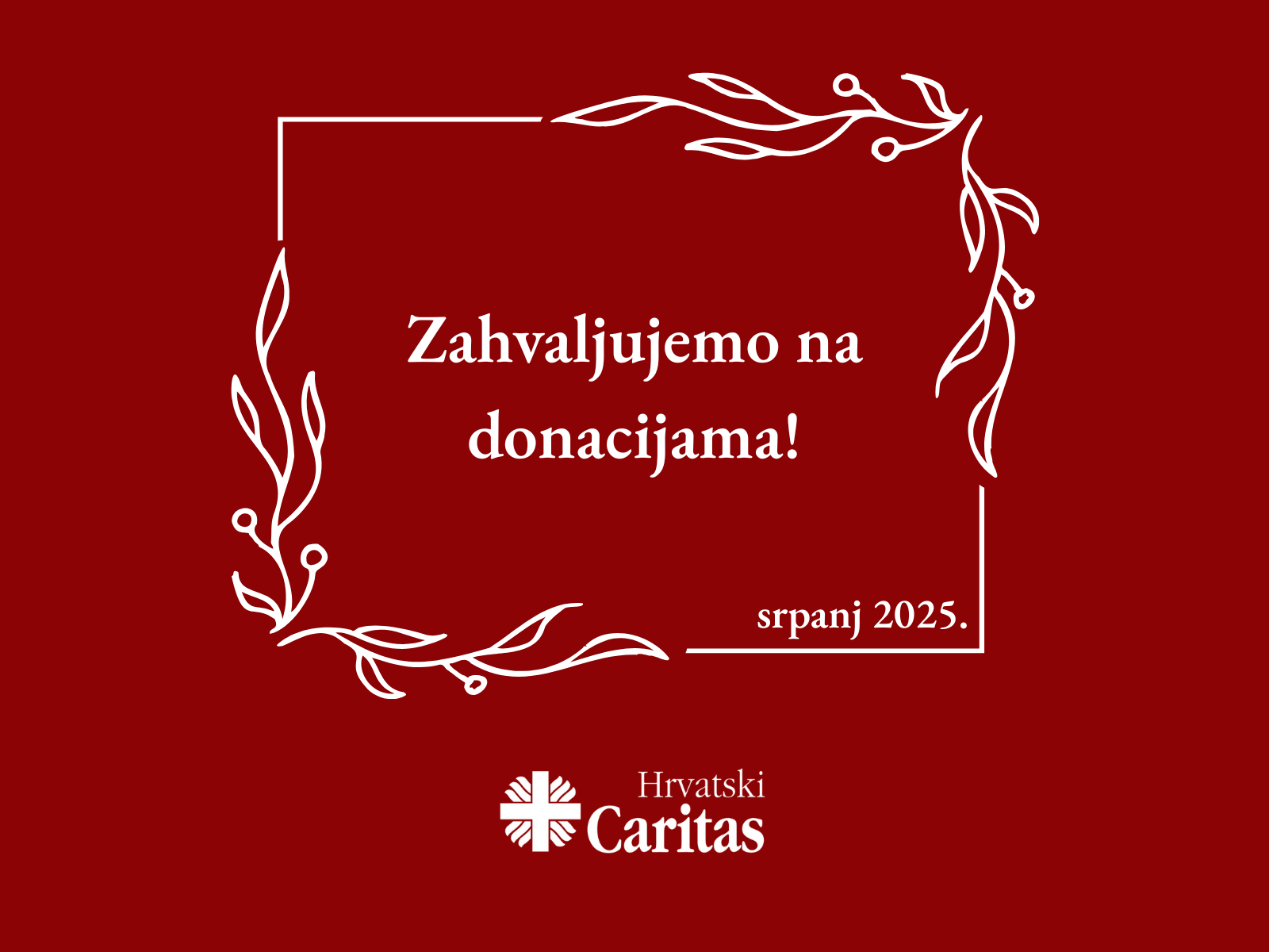 Hrvatski Caritas zahvaljuje svim dobročiniteljima koji su tijekom mjeseca srpnja izdvojili dio svojih sredstava kako bi podržali aktivnosti Hrvatskog Caritasa. Vaša osjetljivost za potrebite omogućuje nam da pomoć uputimo onima kojima je najpotrebnija!